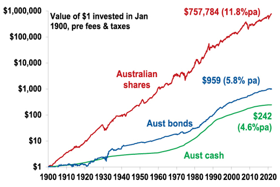 Growth assets like shares and property provide higher returns than defensive assets like cash and bonds over long periods. This is because their growth potential drives higher returns over long periods of time compensating for their higher volatility. The next chart is my favourite demonstration of the power of compound interest in action. It shows the value of $1 invested in 1900 in Australian cash, bonds and shares with earnings on each asset reinvested along the way. Since 1900 cash has returned 4.8% pa, bonds returned 5.8% pa & shares 11.8% pa.
