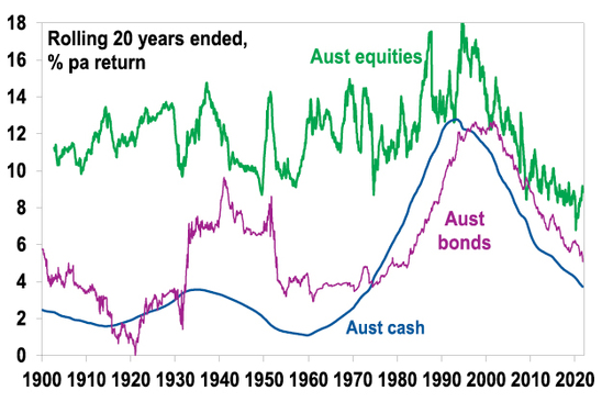 Shares are more volatile than cash and bonds. However, the compounding effect of their higher returns over time results in much higher wealth accumulation from them. Although the return from shares is only double that of bonds, over 121 years the $1 invested in 1900 will have grown to $757,784 today, whereas the $1 investment in bonds will only be worth $959 and that in cash just $242. Of course, investors don’t have 121 years. But the next chart shows rolling 20 year returns from Australian shares, bonds and cash and its evident shares have invariably outperformed cash and bonds over such a period.