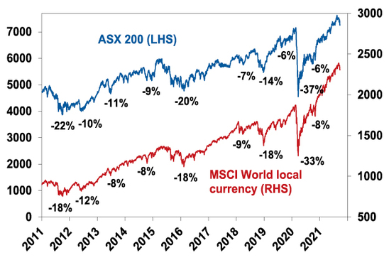 First, while they all have different triggers and unfold differently, periodic corrections in share markets of the order of 5%, 15% and even 20% are healthy and normal. For example, during the tech/dot-com boom from 1995 to early 2000, the US share market had seven pull backs ranging from 6% to 19% with an average decline of 10%. During the same period, Australian shares had eight pullbacks ranging from 5% to 16% with an average fall of 8%. All against a backdrop of strong returns every year. During the 2003 to 2007 bull market, the Australian share market had five 5% plus corrections ranging from 7% to 12%, again with strong positive returns every year. And the last decade regularly saw major pullbacks. See the next chart.