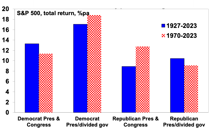 Historically US shares have done best under Democrat presidents with an average return of 14.4% pa since 1927 compared to an average return under Republican presidents of 10% pa. Fortunately, the Republican sweep scenario has been the second-best outcome for shares since 1970. If the Republican’s lose control of the House though, Trump will struggle to cut taxes, and this could see less upwards pressure on bond yields but be bad for shares as Trump could still do the tariff hikes.