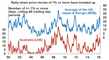 Another approach is to track the number of days when share markets move up or down by 1% or more. This is shown for shares over rolling 40 day trading periods in the next chart. Whereas this was running as low as 5 days in every 40 in 2014 earlier this year it had spiked to around 20 days in every 40.