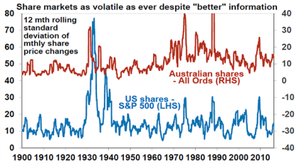 Over the last century or so fundamental drivers of volatility – like economic growth and inflation – have declined, as can be seen in the previous chart that shows the volatility of GDP growth. This decline in economic volatility has been driven by things like the growing role of the more stable services sector, better inventory control & macro management by central banks. This should have resulted in a decline in share market volatility, but the chart below shows that volatility in Australian and US shares is in the same range it’s been in over the last century.