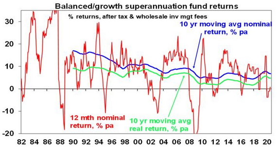 Despite a 35% or so plunge in share markets earlier this year; on the back of the pandemic and rough patches in 2018, 2015 and 2011, well diversified Australian investors have seen pretty good returns over the last 10 years. The median balanced growth superannuation fund returned 5.8% pa over the five years to August and 7.3% pa over 10 years and that’s after fees and taxes. While that’s dull compared to the double digit returns of the higher inflation world of the 1980s and 1990s, it’s pretty good once low inflation of 2% pa or less is allowed for.