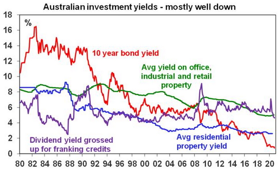 Today the cash rate is 0.25% (and likely to fall to 0.1% next month), 1-year bank term deposit rates are 0.75%, 10-year bond yields are 0.75%, gross residential property yields are around 3%, commercial property yields are around 5%, dividend yields are around 4.5% for Australian shares (with franking credits) but they are 2.25% for global shares. This points to a lower return potential for a diversified mix of assets.