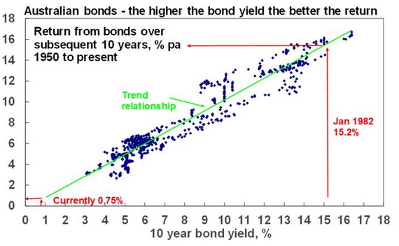 • For bonds, the best predictor of future medium-term returns is current bond yields – as can be seen historically in the next chart. If a 10-year bond is held to maturity its initial yield (0.75% right now in Australia) will be its return over 10 years. We use 5-year bond yields as they more closely match the maturity of bond indexes.