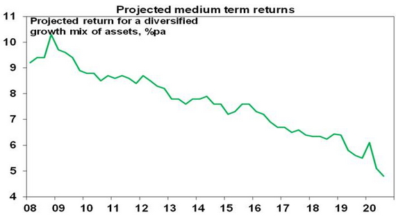 • Fourth, some of the decline in return potential reflects very low inflation – real returns haven’t fallen as much – and 4.8% pa is still well above sub 1% bank term deposit rates.