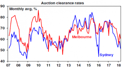 This is unusual in that property price downturns are usually preceded by significant interest rate increases. Consistent with the fall in Sydney and Melbourne property prices, auction clearance rates and home sales have also fallen.