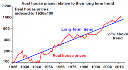 Real capital city house prices are 27% above their long-term trend (see the next chart) and are at the high end of OECD countries in terms of the ratio of prices to income and rents.