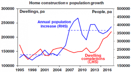 First, the real driver of high home prices and their persistence has been that, thanks to tight development controls and lagging infrastructure, the supply of dwellings has not kept pace with population driven demand. Over the last decade annual population growth has averaged about 150,000 above what it was over the decade to the mid-2000s, which would require roughly an extra 50,000 new homes per year. But it’s only recently that supply has caught up with the pick-up in population growth. And population growth remains very strong.