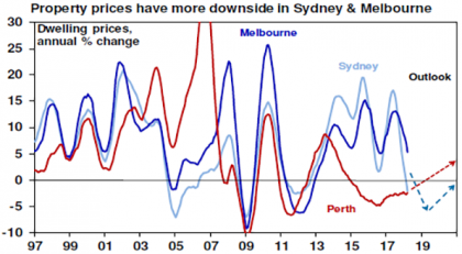 Regional centres are likely to provide relatively faster capital growth reflecting weaker supply and offering more attractive rental yields (around 1.5 percentage points higher than in cities). Units are at greater risk given surging supply, but so far house prices have slowed more in Sydney and Melbourne.