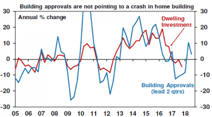 A slowdown in the housing cycle can affect the broader economy via slowing dwelling construction, negative wealth effects on consumer spending and via the banks if mortgage defaults rise. However, as things currently stand the drag from housing construction is likely to be minimal – building approvals don’t point to a collapse in new construction (see the next chart) and it looks like alterations and additions will rise, negative wealth effects will weigh on consumers but not dramatically if we are right, and in the absence of a property price crash the impact on the banks will be manageable. Finally, other sectors of the economy are taking over from housing, eg business investment and state capital works, as being growth drivers.