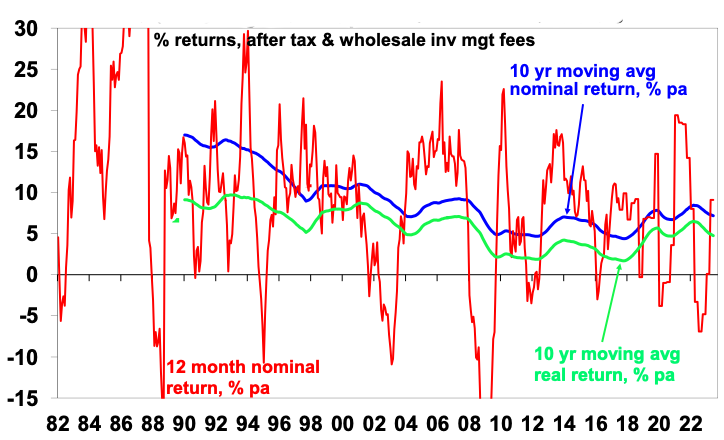 After falling for many years due to the fall in starting point yields for major assets the medium-term return potential using this approach has improved to around 6.7% over the last 15 months (see next chart) due to now higher starting point interest rates and bond yields and somewhat higher starting point yields on shares (which remain down in value from record highs) and commercial property.