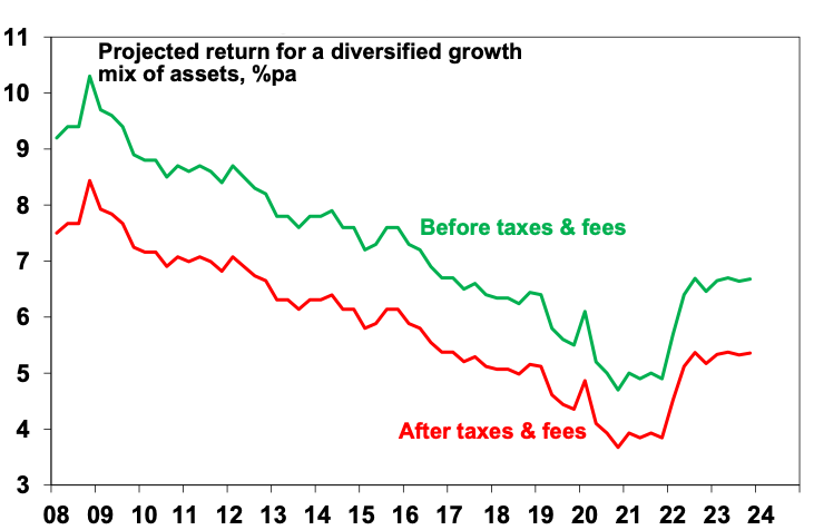 After allowing for taxes and fees this still implies pretty constrained nominal medium term returns for balanced growth super funds based on a traditional mix of assets of 5.5% pa which is a bit below the average since 2000. This is still better than bank term deposit rates which average up to 4.5% before taxes, and makes no allowance for any value added from active investment management.