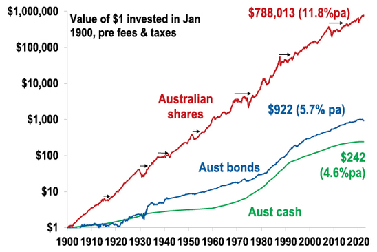 The chart shows the value of $1 invested in various Australian assets in 1900 allowing for the reinvestment of dividends and interest along the way. That $1 would have grown to $242 if invested in cash, to $922 if invested in bonds and to $788,013 if invested in shares. While the average return since 1900 is only double that in shares relative to bonds, the huge difference between the two at the end owes to the impact of compounding or earning returns on top of returns. So, any interest or return earned in one period is added to the original investment so that it all earns a return in the next period. And so on.