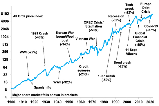 It seems that these days there is always something for investors to worry about. This year it’s particularly the case with surging inflation, supply shortages, central banks tightening monetary policy, rising bond yields, concerns that inverting yield curves may be signalling recession, war in Ukraine and all against the backdrop of periodic coronavirus waves. But while this is real and adds to uncertainty, in a long-term context its mostly noise. The global and Australian economies have had plenty of worries over the last century, but it got over them with Australian shares returning 11.8% per annum since 1900, with a broad rising trend in the All Ords price index as can be seen in the next chart, and US shares returning 9.8% pa. (Note, this chart shows the All Ords share price index, whereas the first chart shows the value of $1 invested in an accumulation index, which allows for changes in share prices and dividends.)