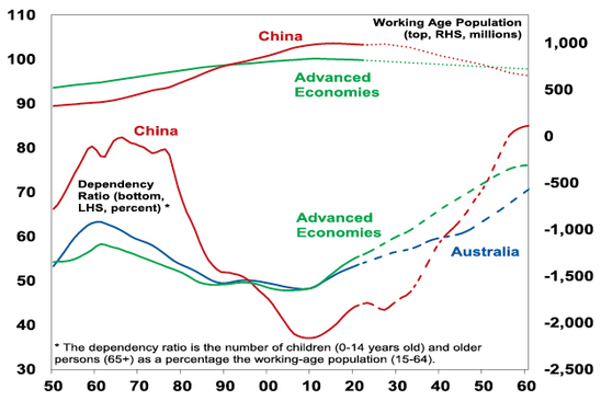 Demographic trends are changing in a number of key ways. Global population growth is slowing, while in advanced countries and China the working age population is now in the process of peaking and starting to decline (see the top portion of the next chart). And, as is well known, populations are aging, resulting in a rise in the ratio of children and older people to working aged people, ie the dependency ratio is rising (bottom portion of the next chart). Thanks to its high immigration program Australia is in a somewhat better position (with a still rising workforce and slower rising dependency ratio). But globally, the upshot is less workers (supply) & more consumers (demand) which will likely add to inflationary pressures. Similarly, “adverse for inflation” demographic trends are flowing from the entry to the workforce of inexperienced millennials and Gen Z as highly experienced baby boomers retire (which is bad for productivity) and the pandemic refocussing workers on quality-of-life making them more demanding in terms of pay and/or retiring early.