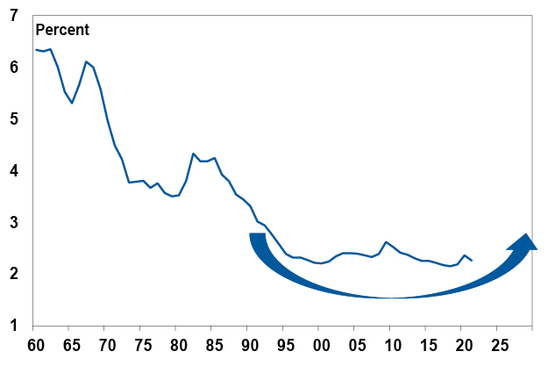 Higher inflation over the medium term than in the pre-pandemic period will remove this tailwind and threaten its reversal: