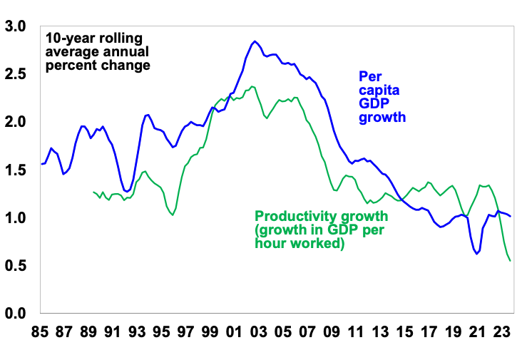 Finally, is the argument that it’s yet another backward step in terms of tax reform. This is critical as in recent years Australia’s productivity performance has deteriorated. This has driven a slump in growth in per capita GDP which means lower than otherwise living standards.