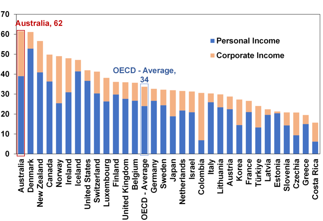 The good news is Australia is a relatively low tax country. Total tax revenue as a share of GDP at 29% in 2022 was at the low end of OECD countries.