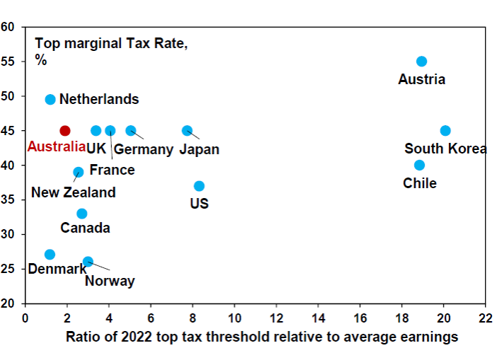 In this regard, not only does the Australian tax system have a high reliance on income tax but it is highly progressive. The current top marginal tax rate at 47% (including Medicare) is above the median of comparable countries and kicks in at a relatively low multiple of average weekly earnings.