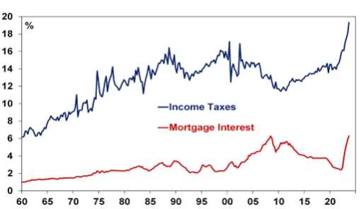 Just keeping up with inflation can see a worker pushed into a tax bracket that was never intended for them. Bracket creep has been a major contributor to the rise in income tax payments as a share of household income to a record level. Over the last two years increasing tax payments have been more of a drag on income than higher mortgage payments.