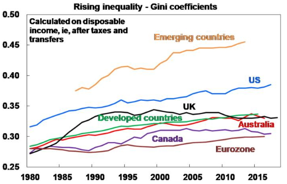 • Inequality (as measured by Gini coefficients) is rising – particularly in the US – which is driving a populist backlash against rationalist market-friendly economic policies of globalisation/free trade (as evident in Trump’s trade wars), deregulation and privatisation.