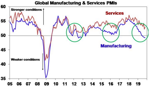 • Business conditions PMIs for the US, Europe & China were flattish in October & may be stabilising. This saw the global manufacturing PMI go sideways and a rise in the services PMI and both still look like the 2012 and 2016 slowdowns.