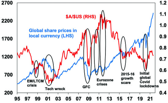 However, this should not be taken to an extreme for two key reasons. First, currency forecasting is hard to get right. Second, having foreign currency in an investor’s portfolio via unhedged foreign investments is a good diversifier if the economic and commodity outlook turns sour. As can be seen in the next chart there is a rough positive correlation between changes in global shares in their local currency terms and the $A. Major falls in global shares which are circled in the next chart saw sharp falls in the $A which offset the fall in global shares for Australian investors. So being short the $A and long foreign exchange provides good protection against threats to the global outlook.