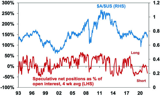 But as can be seen in the chart, it rarely spends much time at the purchasing power parity level. Cyclical swings in the $A are largely driven by swings in the prices of Australia’s key commodity exports and relative interest rates, such that a fall in Australian rates relative to US rates makes it more attractive to park money in the US and hence pushes the $A down. “Investor” sentiment and positioning also impacts – such that if the $A is over-loved with investors overweight in it then it becomes vulnerable to a fall and vice versa if it’s under-loved.