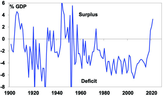 From a long-term perspective the $A is around fair value. The best guide to this is what is called purchasing power parity (PPP) according to which exchange rates should equilibrate the price of a basket of goods and services across countries – see the next chart that shows annual data for the $A back to 1900.