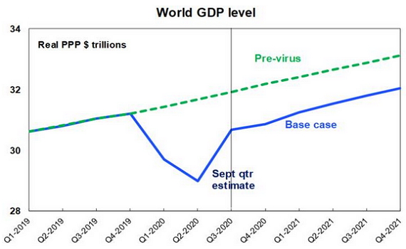 This pattern looks to have been what we have seen so far globally with very sharp falls in GDP in the first half followed by a strong rebound in the September quarter (with GDP data for the US and Europe to be released later this week likely to show an 8% or so rebound), followed by a more uncertain and gradual recovery going forward – particularly as the resurgence of the virus leads to tightening restrictions in Europe (as we are now seeing in France and Germany) and possibly the US. This can be seen in our projections for the level of real global GDP in the next chart. In particular, global GDP will take years to get back to its pre-coronavirus level which means a long period of spare capacity and low inflation/low interest rates.