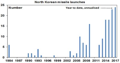 North Korea – The risk here has risen as its missile tests have increased and within a few years it may have the capability to lob a missile with a nuclear warhead into the US (or Australia). A US missile strike is possible but would risk significant loss of life in Seoul and beyond. So a diplomatic solution aimed at containment is the most likely. Time will tell if this is successful but trying to protect an investment portfolio against the uncertain timing of North Korean risk is a bit like trying to protect it against a nuclear war in the Cold War.