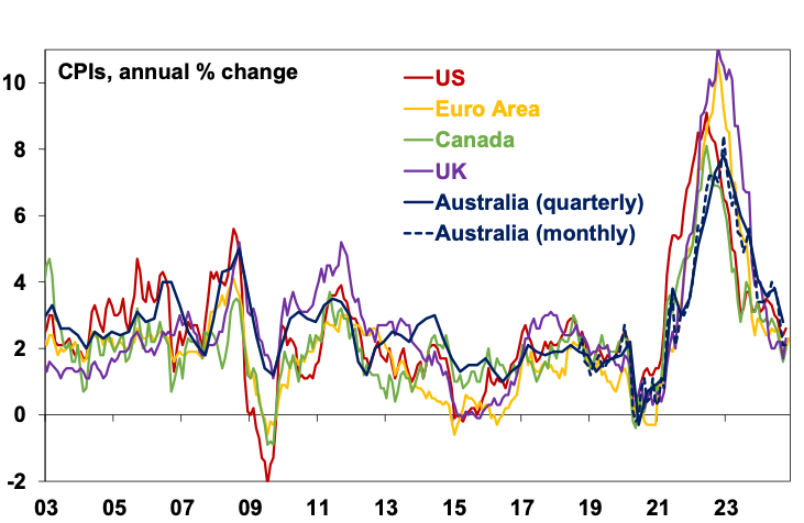3. Further disinflation. Inflation in major countries has fallen sharply from peaks of 8 to 11% in 2022 to around 2 to 3% in 2024. Australia lagged on the way up and is doing the same on the way down.