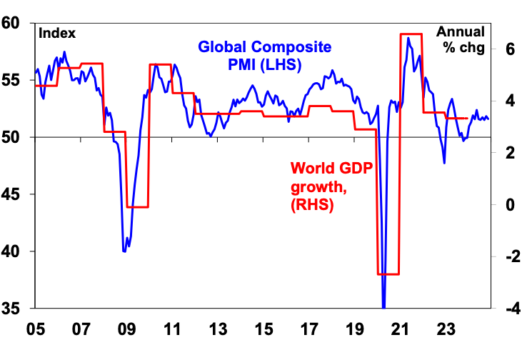 1. Stronger than feared growth. Yet again the much feared recession failed to materialise. Despite the monetary tightening of 2022 and 2023 and China’s property collapse, global growth in 2024 remained just above 3%. In Australia, despite a “per capita recession”, economic growth remained positive albeit at only around 1% helped by strong population growth, stronger than expected growth in public spending and labour hoarding offsetting severe mortgage pain for some.