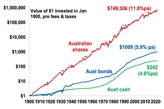 For an investor, time is your friend and the earlier you start the better. This along, with having exposure to growth assets, is the best way to take advantage of the magic of compound interest. Fortunately, the Australian superannuation system is based on just that. The next chart shows the value of $1 invested in various Australian asset classes since 1900 allowing for the reinvestment of any income along the way. That $1 would have grown to $246 if invested in cash, $1009 in bonds but $749,306 if invested in shares. While the average share return is only double that in bonds, the huge gap in the end result owes to the magic of compounding returns on top of returns. A growth asset like property is similar to shares over long periods in this regard. Short-term share returns bounce around and can go through lengthy bear markets (shown with arrows on the chart). But the longer the period you allow to build your savings, the easier it is to look through short-term market fluctuations, and the greater the time the compounding of higher returns from growth assets has to build on itself.