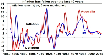 • Historically, bond yields have remained low after a long-term downswing for around several years as it takes a while for growth and inflation expectations to really turn back up. See the circled areas for US and Australian bond yields in the second chart in this note.
