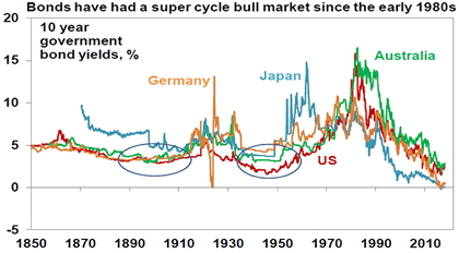 The fall in inflation over the last 30-40 years reflects: the inflation-fighting policies of central banks; supply side reforms that boosted productivity; globalisation that brought a billion or so workers into the capitalist system; and the benefits of the information technology revolution harnessed by the likes of Amazon and Uber. The fall in inflation in turn has been the main driver of a super cycle bull market in bonds, with yields trending down since the early 1980s. (Don’t forget, when bond yields fall, bond prices rise. Suppose the government issues a $100 bond paying $4 pa in interest for an initial yield of 4%. If investors push yields down to 3%, the bond’s price will be pushed up until the 3% yield is achieved with the $4 interest payment.)