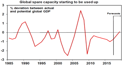 • Global growth is now starting to run above potential again and this is leading to a decline in spare capacity and with global growth now accelerating this is likely to have been used up by late next year. Diminishing spare capacity makes it easier for companies to raise prices.