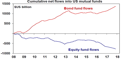 Thirdly, bonds remain over loved with a huge post-GFC inflow into bond funds in the US. (The same picture applies if ETFs are added in.) This leaves them vulnerable to a reversal if investor sentiment towards them turns really negative.