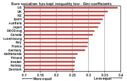 As might be expected, emerging countries are less equal than advanced countries but the key point is that there has been a general trend higher in inequality during the last 30 years. This is particularly evident in the emerging world and the US, but less so in the Eurozone where it’s actually been stable since the mid-1990s. There has also been a rising trend in Australia, although its stabilised since 2008 (and the data pre 1994 is less reliable). In terms of advanced countries, the US and UK are the least equal, and Eurozone and Scandinavian countries tend to be more equal. Inequality in Australia is above the OECD average but below that in the US and UK – see the next chart.