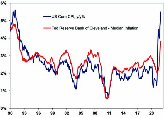 Initially, it was narrowly based on a few categories subject to reopening, but it has broadened out with the median level of US CPI components’ inflation rates rising sharply and 75% of US CPI components seeing inflation above 3%yoy. In a big picture sense, the surge in inflation in the US is consistent with a large increase in its money supply, which has fed through to demand via significant fiscal easing. The further supply side disruptions associated with the Omicron wave are not helping.