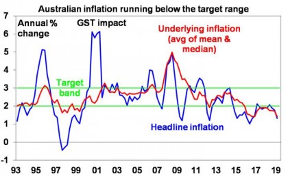 Due to the slowdown in economic growth flowing partly from the housing downturn we have been looking for two rate cuts this year since last December. We had thought that the RBA would prefer to wait till after the election is out of the way before starting to move and coming fiscal stimulus from July also supports the case to wait as does the still strong labour market. However, with underlying inflation coming in much weaker than expected the RBA its arguably too risky to wait until unemployment starts to trend up. And the RBA has moved in both the 2007 and 2013 election campaigns. So, while it’s a close call our base case is now for the first rate cut to occur at the RBA’s May meeting. Failing that, then in June.