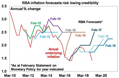 The problem for the RBA is that inflation has been undershooting its forecasts and the target for several years now. The longer this persists the more the RBA will lose credibility, seeing low inflation expectations become entrenched making it harder to get inflation back to target and leaving Australia vulnerable to deflation in the next economic downturn.