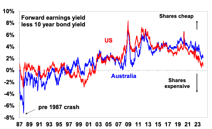 Shares are not cheap with above average forward PE’s and a lower risk premium on offer over bonds than seen over the last decade – which leaves shares a bit vulnerable given the high level of economic and geopolitical risks which will likely contribute to volatility. However, the risk premium is a bit higher than it was last October thanks to lower bond yields and shares should be okay providing central banks cut interest rates this year and the profit outlook improves.