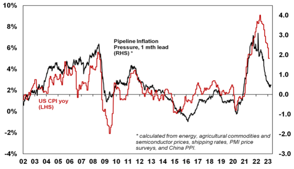 Inflation is still too high but it looks to have peaked. US inflation led on the way up and it looks to be leading on the way down. It has fallen to 5%yoy from a high of 9.1% in mid last year. Supply bottlenecks have improved, freight costs have fallen and slowing demand is reducing demand side inflation. While core services inflation excluding shelter remains sticky it is starting to slow, shelter (or rent) inflation also looks to have peaked and our US Pipeline Inflation Indicator continues to point to lower inflation.