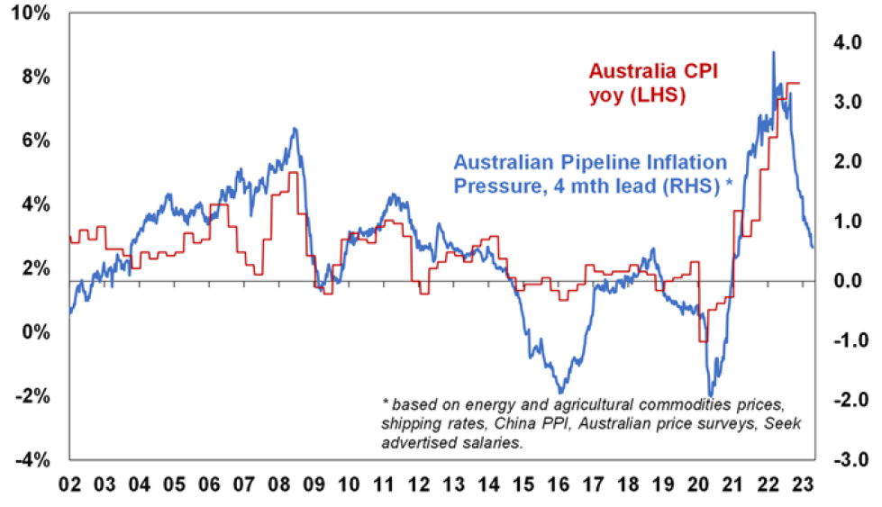 In Australia, inflation is lagging the US by about six months and looks to have peaked in the December quarter. There is likely more upside in electricity prices and rents, and based on the US experience underlying measures of inflation may take a bit longer to peak. However, the ABS’ Monthly CPI Indicator fell back to 6.8%yoy in February from a high of 8.4% in December and our Australian Pipeline Inflation indicator points to a further fall in inflation ahead.