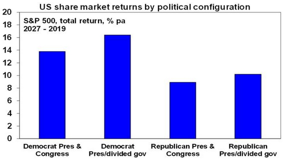 For those worried about “left wing” Democrats, it’s worth noting that US shares have done best under Democrat presidents with an average return of 14.6% pa since 1927 compared to an average return under Republican presidents of 9.8% pa. However, the best average result has actually occurred when there has been a Democrat president and Republican control of the House, the Senate or both. This has seen an average return of 16.4% pa. By contrast the return has only averaged 8.9% pa when the Republicans controlled the presidency and Congress.
