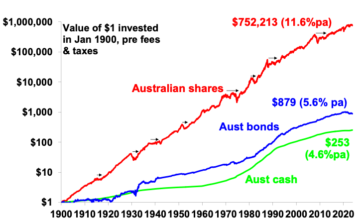 Making the most of compound interest – which refers to the way returns compound on past returns for an investor over long periods – is the most important thing an investor needs to do if they want to build wealth. It works best for growth assets. The next chart shows the value of one dollar invested in 1900 in Australian cash, bonds and equities with interest and dividends reinvested along the way, before fees and taxes. That one dollar would be worth $253 today if it had been invested in cash. But if it had been invested in bonds it would be worth $879 and if it was allocated to shares it would be worth $752,213. Although the average return on shares (11.6% pa) is just double that on bonds (5.9% pa), the magic of compounding higher returns leads to a substantially higher balance. The same applies to other growth assets like property. So, the best way to build wealth is to take advantage of the power of compound interest and have a decent exposure to growth assets. Of course, there is no free lunch and the price for higher returns is higher volatility but the impact of compounding returns from growth assets is huge over long periods.