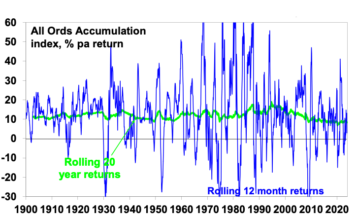 This is often because investment markets go through cyclical swings. All eventually set up their own reversal – eg, as falls make shares cheap and low interest rates help them rebound. But the outcome is extreme volatility in short term returns as evident in the next chart which shows the pattern of rolling 12 month ended returns in Australian shares (compared to rolling 20 year ended returns).