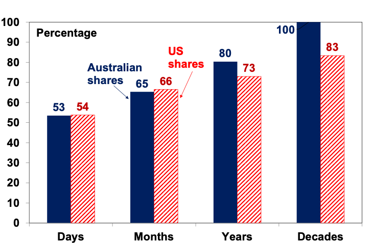 • Don’t check your investments so regularly – on a day-to-day basis it’s a coin toss as to whether the share market will rise or fall but the longer you stretch it out between looking at your investments the more likely you will get positive news. See the next chart.